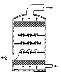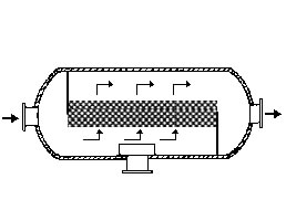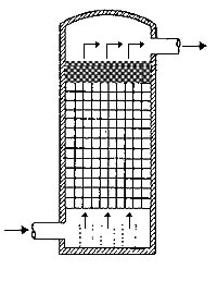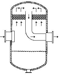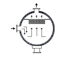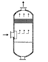 在通常的化工操作中所碰到的氣體中分散液滴的直徑約在0.1~5000μm。一般粒徑在100μm以上的顆粒因沉降速度較快,其分離問題很容易解決。通常直徑大于50μm的液滴,可用重力沉降法分離;5μm以上的液滴可用慣性碰撞及離心分離法;對于更小的細霧則要設法使其聚集形成較大顆粒,或用纖維過濾器及靜電除霧器。絲網除沫器,其主要用于分離直徑大于3μm~5μm的液滴,工作原理如右圖所示。當帶有霧沫的氣體以一定的速度上升,通過架在格柵上的金屬絲網時,由于霧沫上升的慣性作用,使得霧沫與細絲碰撞而粘附在細絲的表面上。細絲表面上的霧沫進一步擴散及霧沫本身的重力沉降,使霧沫形成較大的液滴沿著細絲流至它的交織處。由于細絲的可濕性、液體的表面張力及細絲的毛細管作用,使得液滴越來越大,直至其自身的重力超過氣體上升的浮力和液體表面張力的合力時,就被分離而下落,流至容器的下游設備中。只要操作氣速等條件選擇得當,氣體通過絲網除沫器后,其除沫效率可達到97%以上,可以達到完全去除霧沫的目的。絲網除沫器(除霧器)用于分離塔中氣體夾帶的液滴,以保證有傳質效率,降低有價值的物料損失和改善塔后壓縮機的操作,一般多在塔頂設置絲網除沫器?捎行コ3--5um的霧滴,塔盤間若設置除沫器,不僅可保證塔盤的傳質效率,還可以減小板間距。所以絲網除沫器主要用于氣液分離。亦可為空氣過濾器用于氣體分離。此外,除沫器絲網還可作為儀表工業(yè)中各類儀表的緩沖器,以防止電波干擾的電子屏蔽器等。在化工工藝過程中,各種氣液相接觸設備的氣體離開設備時往往夾帶著不少液滴,如塔類設備、蒸發(fā)器等。一般要求把氣體中夾帶的液滴分離出來,以免影響氣體的品質或下道工序的操作。從氣體分離液滴或霧沫的機理有重力下降、慣性碰撞、離心分離、布朗運動的擴散沉積和靜電吸引。絲網除沫器是屬于慣性碰撞除沫中的典型產品,是一種高效的氣液分離設備。它具有除沫效率高、結構簡單、空隙率大、壓力降小、重量輕,安裝、操作、維修方便等特點。當氣體自下而上通過絲網除沫器時,由于慣性作用與絲網表面碰撞,霧沫隨即在細絲表面聚集而擴張,不斷變大的液滴由于重量產生的重力超過氣速和液體表面的張力的合力時,液滴就下落。工業(yè)上常用于塔器、蒸發(fā)器和分離器等。